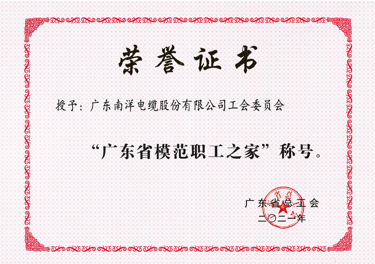 廣東南洋電纜股份有限公司工會委員會 被授予“廣東省模范職工之家”榮譽稱號